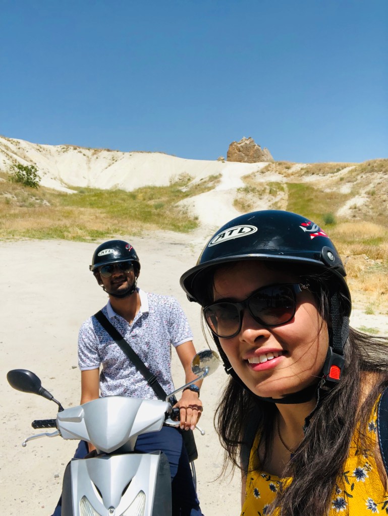 Exploring the region on our bike – We hired a scooter for a day to explore the region on our own. It was very convenient to see the nearby places. We explored the moonscape valleys of Cappadocia, Pasabagi fairy chimneys, Zelve Open Air museum. At the end, we stopped to admire the mesmerizing sunset from the Rose Valley and spent some time there.